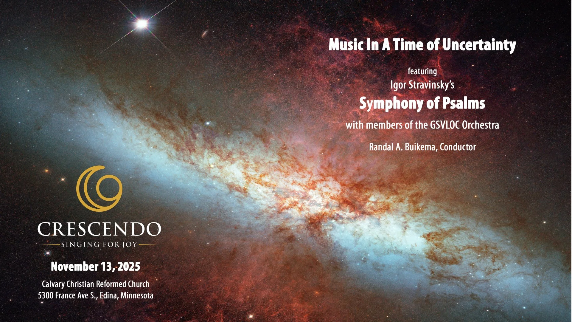 Join us this Fall as Crescendo embarks on its most ambitious project, Music For A Time of Unrest, featuring Igor Stravinsky’s masterwork, Symphony of Psalms. Composed in 1930 while Stravinsky lived in France, Symphony of Psalms encapsulates the angst of the time and concludes with a sublime resolution. Additional selections—How Can I Keep From Singing, “All of Me” from Vision Unfolding, and The Promise of Living—create a journey from unrest, to action, to hope for the future. The audience joins in singing Aquarius/Let the Sunshine In, providing a celebratory conclusion.