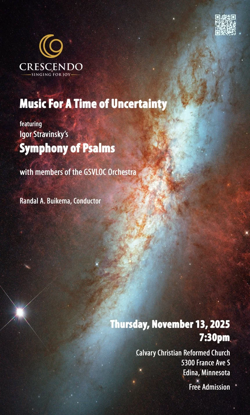 Crescendo Chorus’ most ambitious project, Music For A Time of Unrest, featured Igor Stravinsky’s masterwork, Symphony of Psalms. Composed in 1930 while Stravinsky lived in France, Symphony of Psalms encapsulates the angst of the time and concludes with a sublime resolution. Additional selections—How Can I Keep From Singing, “All of Me” from Vision Unfolding, and The Promise of Living—create a journey from unrest, to action, to hope for the future. The audience joined in singing Aquarius/Let the Sunshine In, providing a celebratory conclusion.